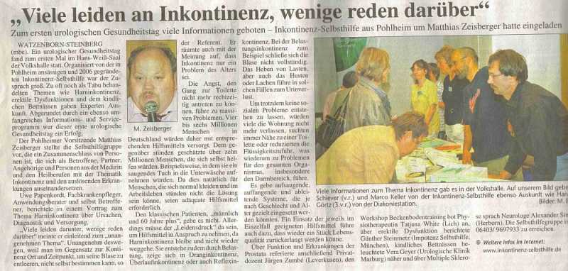 Im März 2008 veranstalteten wir einen Urologischen Gesundheitstag. Dieser bot zahlreiche Stände diverser Firmen und Dienstleister (unter anderem kostenfreier PSA Test) und gleich fünf Fachvorträge zu unterschiedlichen Themen. Ein Workshop (völlig überlaufen) zum Thema Beckenbodentraining ergänzte die Veranstaltung. Wir konnten an diesem Tag über 250 Besucher begrüßen, brachen uns einen Fuß beim Aufräumen der Veranstaltungshalle (Anne) und waren dennoch mehr als glücklich.
