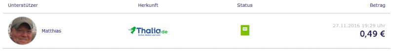 Im Übrigen funktioniert dies alles tadellos. Ich habe bei thalia.de ein Buch über 7,50 Euro gekauft und dem Verein wurden direkt 0,49 Euro gutgeschrieben. Dies ist doch tatsächlich bei diesem Kaufpreis eine stolze Summe.