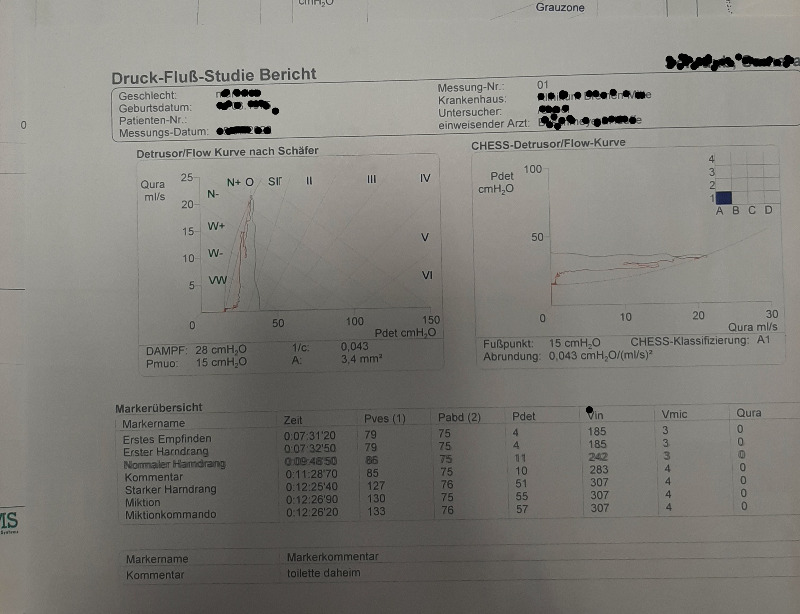 Aus meiner Sicht liegst du da in einer Grauzohne. Wenn man nur das CESS Nomogram nimmt ist das mit A1 Ok - das Problem dabei ist, das diese Nomogarmme nicht geschlechtsspezifisch sind - bedeutet ursprünglich für die männliche Anatomie entworfen wurden. J. Blaivas (Blaivas JG, Groutz A (2000) Bladder outlet obstruction) hat das auch für Frauen gemacht - und da kommt in deinem Fall eine leichte Obstruktion heraus wenn man die CESS Werte im Nomogram abbildet. Wenn man den maximalwert aus dem Bild EMG nimmt, der ungefähr bei 60 oder 80 sogar cmH2O liegt währe es sogar eine mäßige Obstruktion.