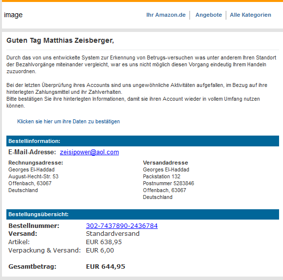 Ich hatte vor einiger Zeit auch eine Betrugs-EMail (angeblich von Amazon) im Postkasten.