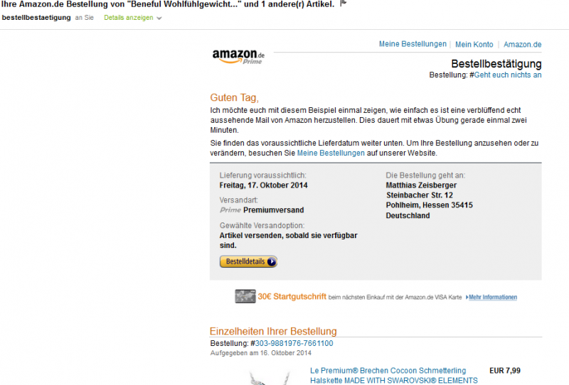 Spam kennt ja wahrscheinlich jeder von uns. Gestern habe ich aber eine Mail erhalten, die so viele persönliche Daten enthielt und zudem täuchend echt aussah.