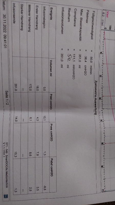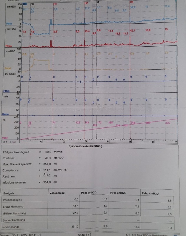 also die Compliance mit 111 ml/cmH2O sind aus meiner Sicht ein Artefaktfehler, der den Detrusor Kontraktionen geschuldet ist, die bei der Füllung aufgetreten sind - das könnte zu der interpretation atonale Blase geführt haben.