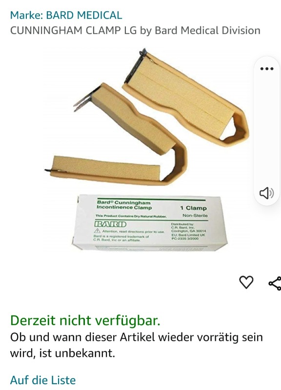 Hallo, habe eine Frage zu Penisklemmen. Bin nach Prostata OP hochgradig inkontinent und habe in der Vergangenheit täglich 6-8 Tena 3 Einlagen benutzt. Im Alltag ist das nicht immer praktikabel, daher habe ich zuletzt Penisklemmen ausprobiert. Dabei war eine Klemme Bart Cunningham am besten für mich, kann sie aber nicht beschaffen da sie aus USA ist und wohl nicht nach D versendet wird. Auch lokale Anbieter können nicht liefern.