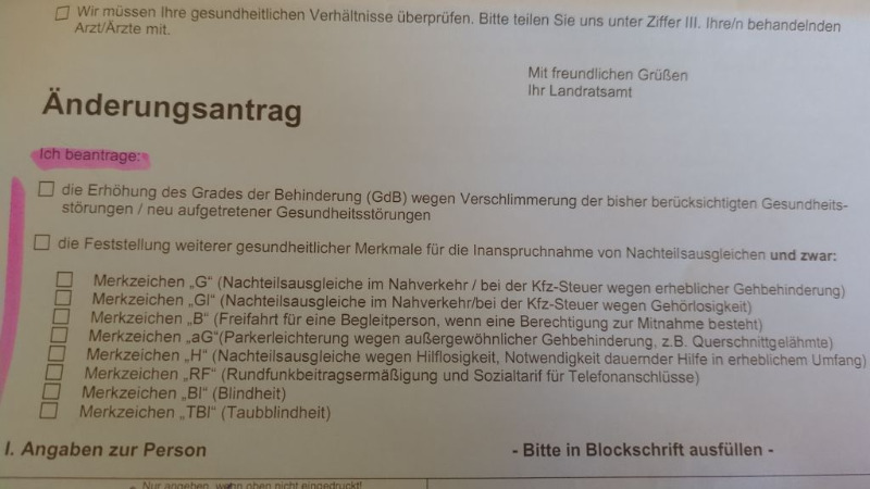 Bitte teilen Sie uns auf dem beigefügten Formular mit, ob Sie außer der Erhöhung des GdB auch Merkzeichen für die Inanspruchnahme von (weiteren) Nachteilsausgleichen beantragen wollen...