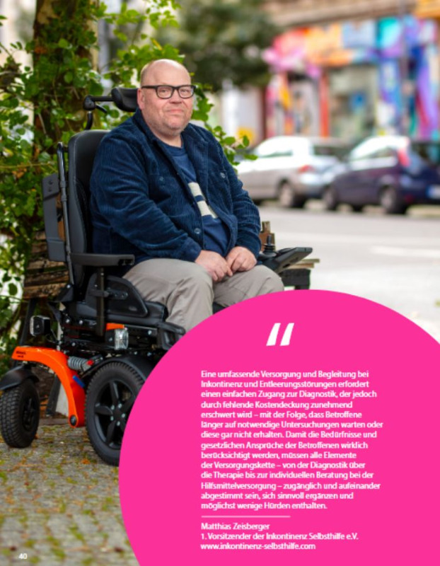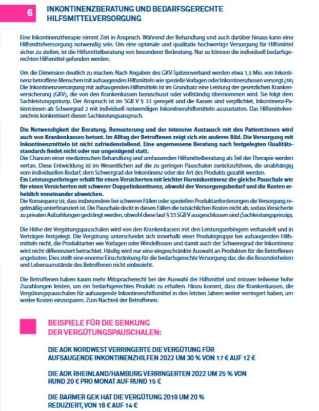 bei der Broschüre handelt es sich um ein politisches Forderungspapier, das von der Fachgesellschaft Deutsche Kontinenz Gesellschaft e.V. herausgegeben wird. Die Publikation richtet sich nicht unmittelbar an Betroffene, sondern vertritt deren Interessen und Anliegen auf politischer Ebene.