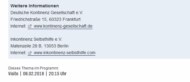 Die interessante Sendung kann auch jetzt noch online angesehen werden. Im zugehörigen Artikel auf der Homepage des NDR wird die Inkontinenz Selbsthilfe e.V. als Ansprechpartner für Betroffene genannt.