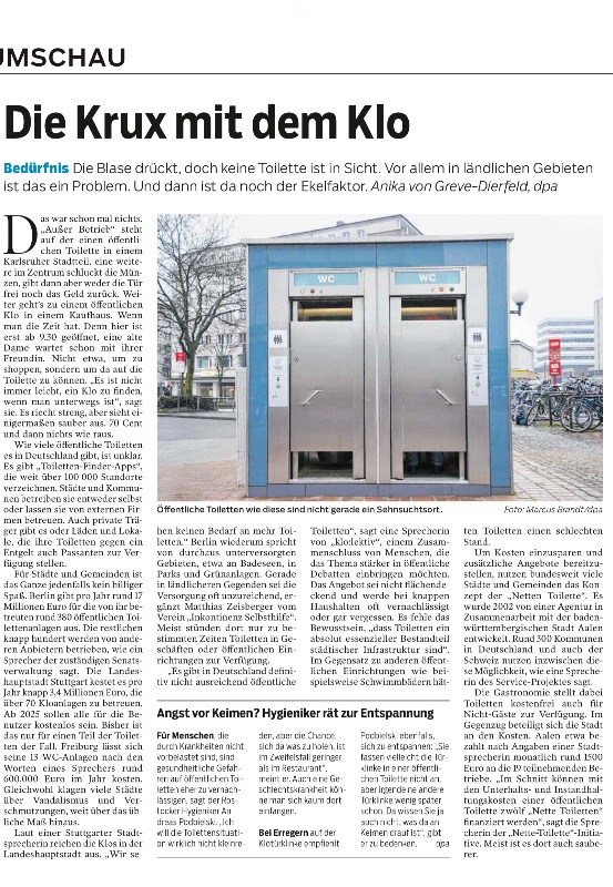 vor ein paar Tagen habe ich der dpa ein Interview gegeben, in dem es um die Verfügbarkeit und Zugänglichkeit von Toiletten sowie den bestehenden Handlungsbedarf ging. Als Ergebnis wurden zahlreiche Artikel in renommierten Medien veröffentlicht, die den Verein namentlich erwähnen.