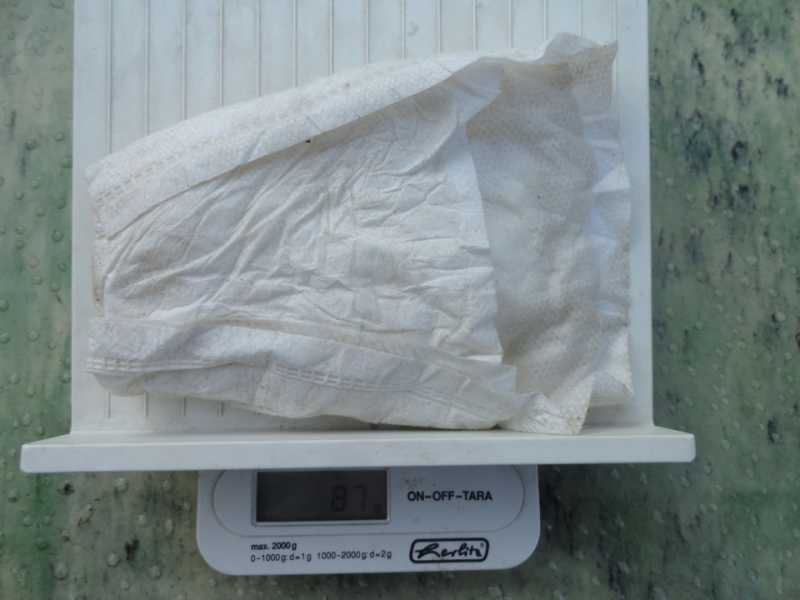 Nach einer Lagerzeit von ca. 40 Stunden in der etwa 4% Salzlake wurde diese Vorlage in Ermanglung einer Wäscheschleuder ausgewrungen und gewogen. Das Gewicht betrug dann 87 Gramm.