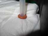 Dazu wird mit einem spitzen Gegenstand( Ahle, Priem, Anreißnadel, Körner, etc.) ein Loch vorgestochen. Mit einem dickeren Stab wird das Loch auf die nötige Größe erweitert, sodass der Ableitungsschlauch straff durchgesteckt werden kann.