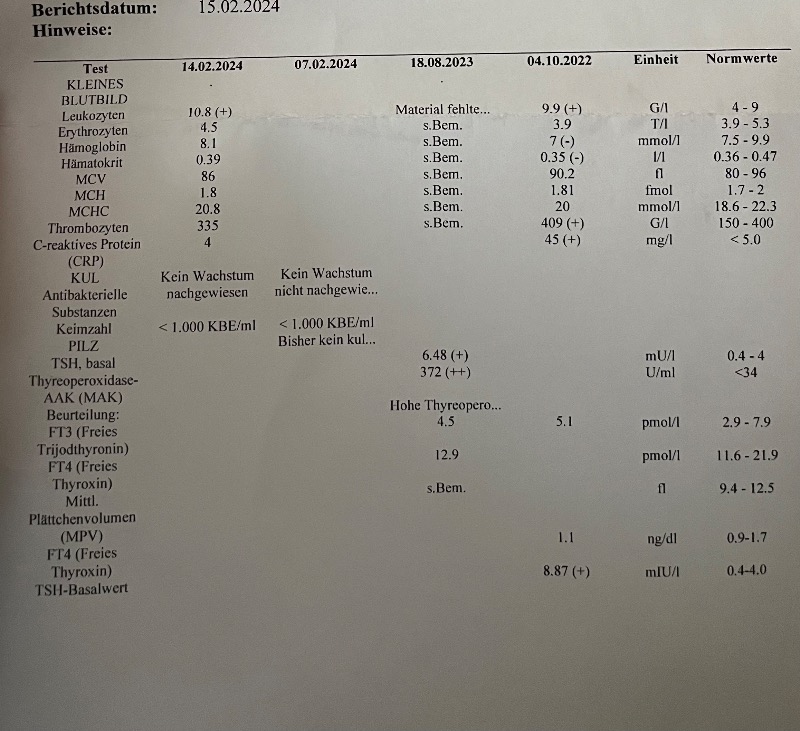 In der Untersuchung von 8/23 fällt auf, das die MAK Werte (Mikrosomale Antikörper) ungewöhnlich hoch sind. Wurde die Schilddrüse mal geschallt und das weiterverfolgt? Ich würde an deiner Stelle darum bitten, das die Schilddrüsenwerte auch noch mal mit erhoben werden und dieses Blatt zur Untersuchung mitnehmen. Das mit den MAK Werten muss jetzt nichts heißen und man kann das eigentlich immer nur zusammen mit anderen Parametern im Verlauf beurteilen aber wenn man so etwas findet sollte man eigentlich in der Folge noch mal nachschauen um eine Referenz zu haben.