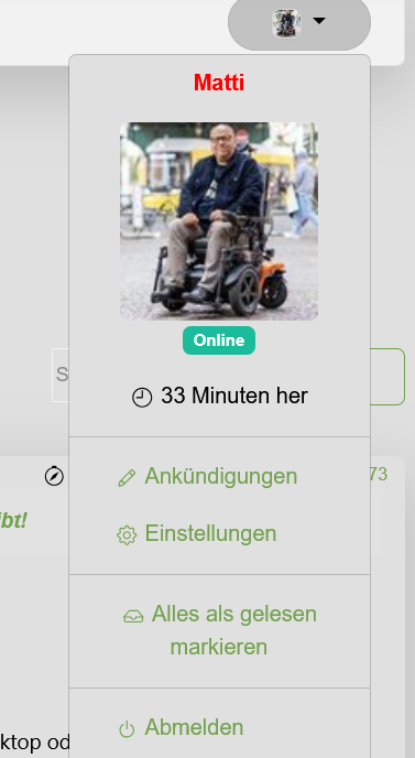 Was die Online-Anzeige betrifft: Es gibt noch einige kleinere Fehler. Das hatte ich allerdings einkalkuliert, da wir eine sehr alte Software auf die neueste Version aktualisiert haben und es bei einigen Berechnungen noch hakt. Ich habe die Anzeige jetzt angepasst. Im Profil (über das kleine Männchen in der Forennavigation zum Anmelden) wird der korrekte Status nun angezeigt. In einem Beitrag unter dem Profil wird der Status allerdings gar nicht mehr dargestellt, also auch nicht „offline“. Das ist zwar noch nicht die optimale Lösung, aber es macht wenig Sinn, etwas anzuzeigen, was nicht richtig funktioniert.
