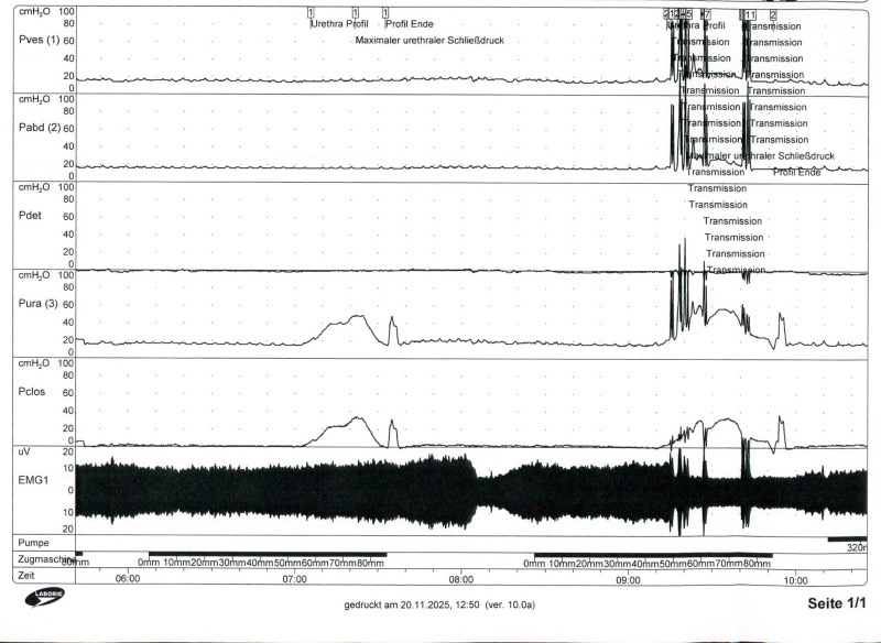 Wie beim letzten Mal ist auch dieses Mal keine Urodynamik im eigentlichen Sinn, sondern eine Uretradruckprofil-Messung durchgeführt worden. Diese Messung verwendet man dafür, eine Belastungsinkontinenz besser zu verstehen, aus ihr kann man nur wenig Rückschlüsse auf die dynamische Drucksituation / Reaktion der Blase bei Füllung ziehen.