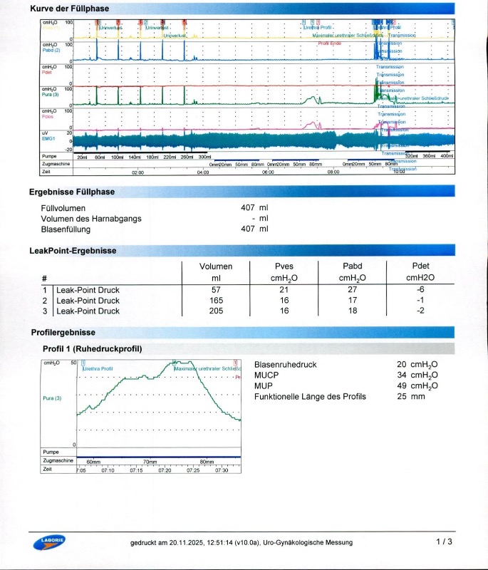 Meinem Verständnis nach hast Du in der ersten Füllphase (0-300 ml) drei mal Harn verloren. Man sieht das Auf dem Blatt 1, erstens oben bei den Messkurven und zweitens im Feld "LeakPoint-Ergenisse". Wenn ich mit die Drück anschaue, geschah der Urinverlust provoziert (vermutlich wurdest Du da aufgefordert zu Husten). Nach den 300 ml wurde der Messkatheter zurückgezogen, um das Transmissionsprofil des Drucks zu messen; ich fühle mich nicht kompetent, um die Werte zu kommentieren.Zu guter letzte wurde die Blase noch auf 407 ml gefüllt. Wie ich die Aussagen interpretiere, hast Du ausser bei den provozierten Tests keinen Harn verloren.