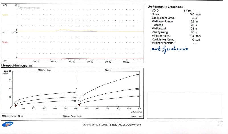 Ich spüre keinen Harndrang und auch nicht die Restharnmengen. Die erste Uroflow Messung wurde direkt nach Spontanurin gemacht, deshalb nur 32 ml. Im Ultraschall wurden 220 ml gemessen, bei der Katheterisierung kamen dann aber fast 300 ml.