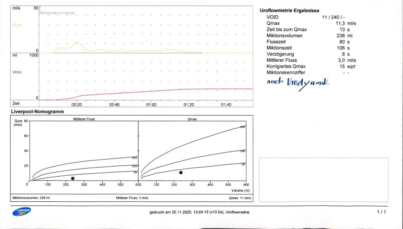 Das aus meiner Sicht wichtigste - und hier vermutlich auch wegweisende Ergebnis ist, das ist der aufgezeichnete Uroflow. Während die Messung vor deiner OP im Normbereich lag, zeigt sie jetzt ein sehr schlechtes Ergebnis, von dem man allerdings die Ursache nicht ableiten kann. Hierfür wäre tatsächlich eine urodynamische Untersuchung notwendig, die aber nicht stattgefunden hat.